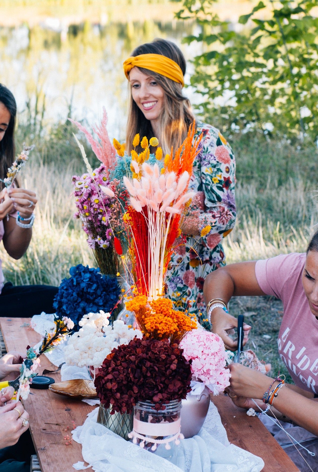 Chez A l’Improvise, chaque atelier est une expérience joyeuse et inspirante, où vous repartez avec votre création unique : couronnes, bouquets ou objets décoratifs en fleurs séchées.