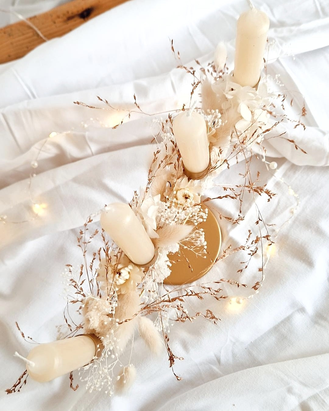 Il est agrémenté de fleurs séchées  et stabilisées dans les tons de blanc et doré