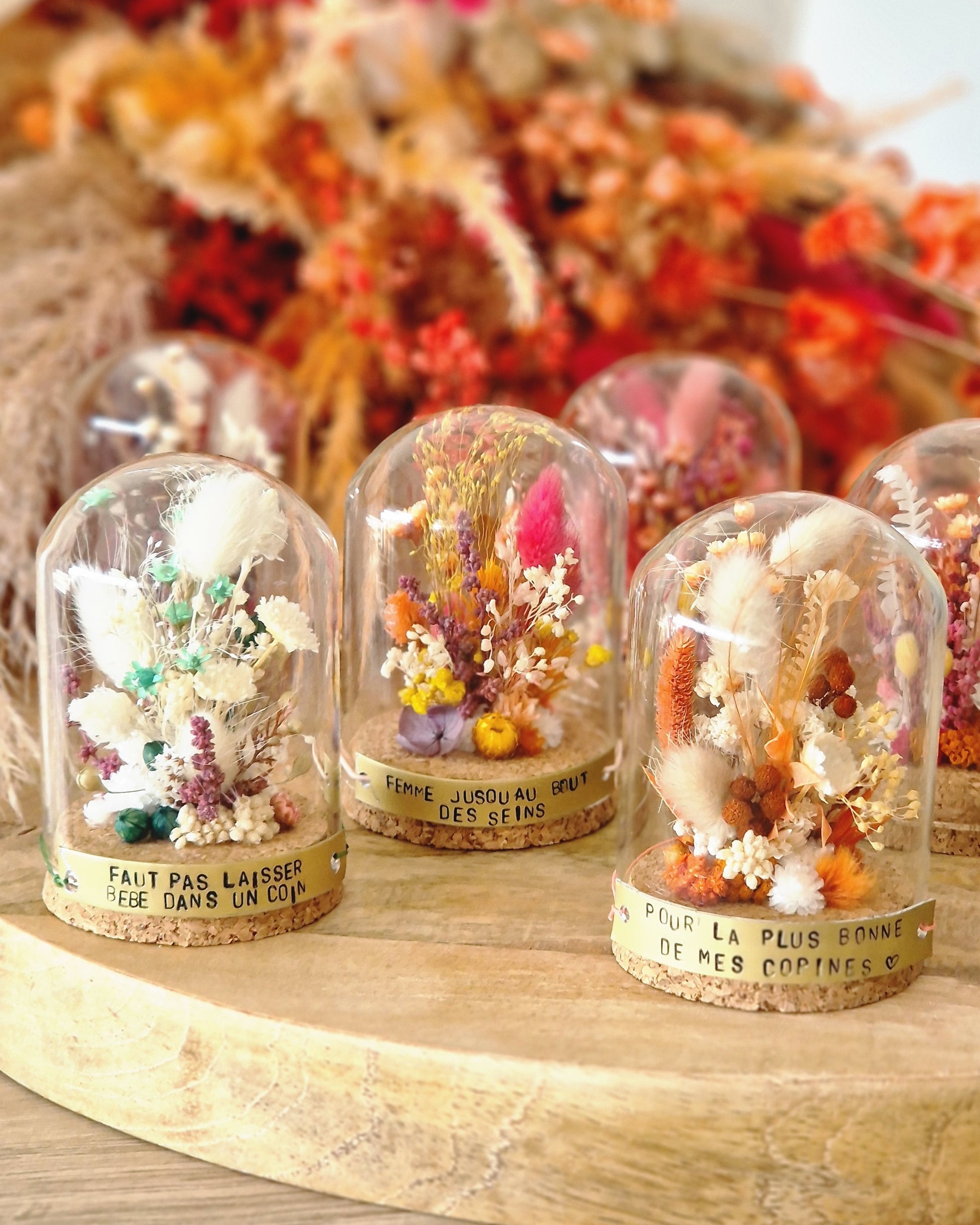 Les fleurs utilisées sont séchées et stabilisées, elles conserveront donc leur forme sans faner. Pour conserver la couleur, évitez d’exposer votre cloche en plein soleil ou dans une pièce humide.