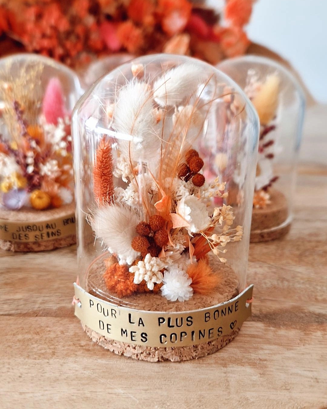 Cloche fleurie en verre , agrémentée de fleurs séchées et stabilisées avec message personnalisable sur plaque en métal doré