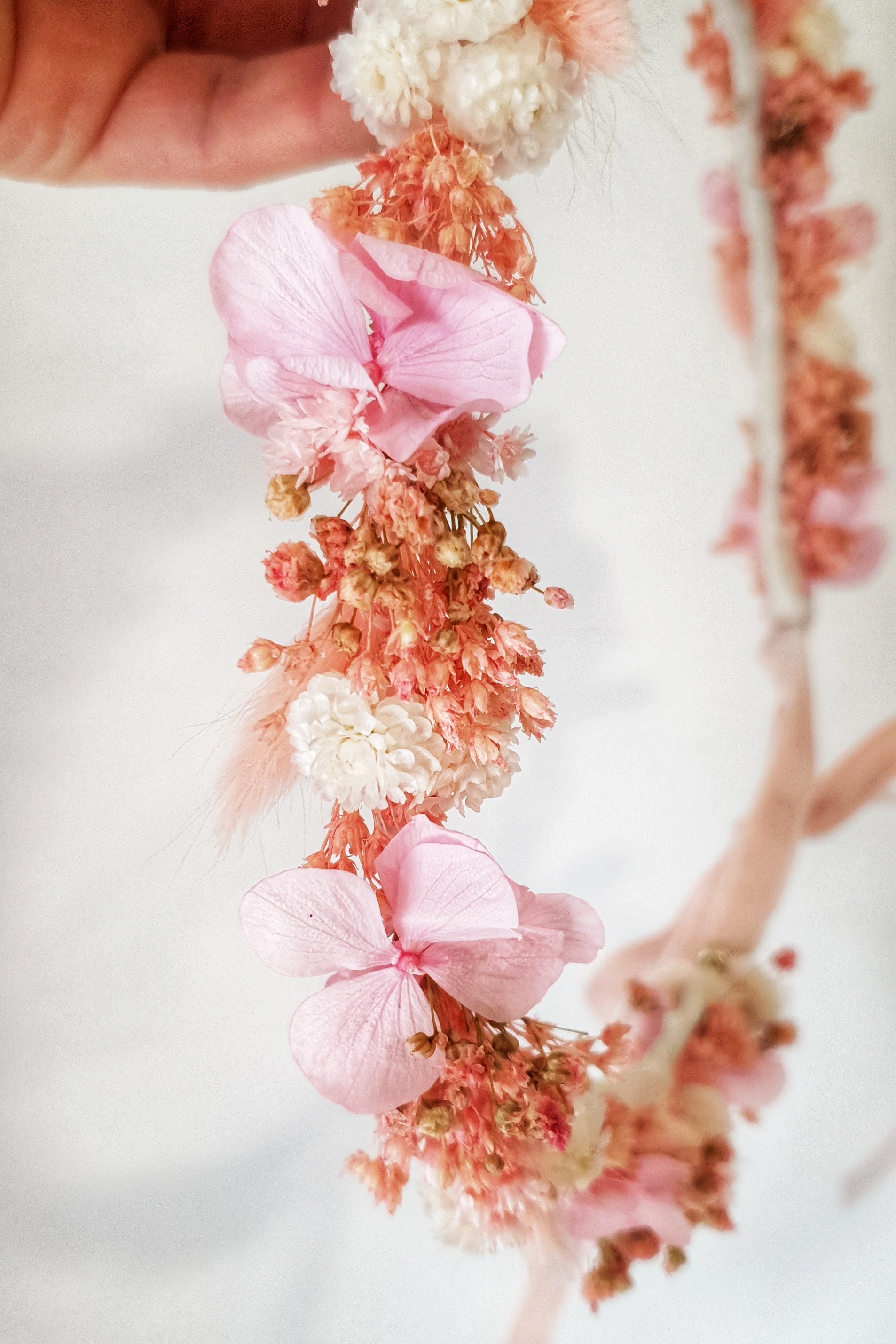 Couronne cheveux en fleurs séchées et stabilisées dans les tons de rose et blanc