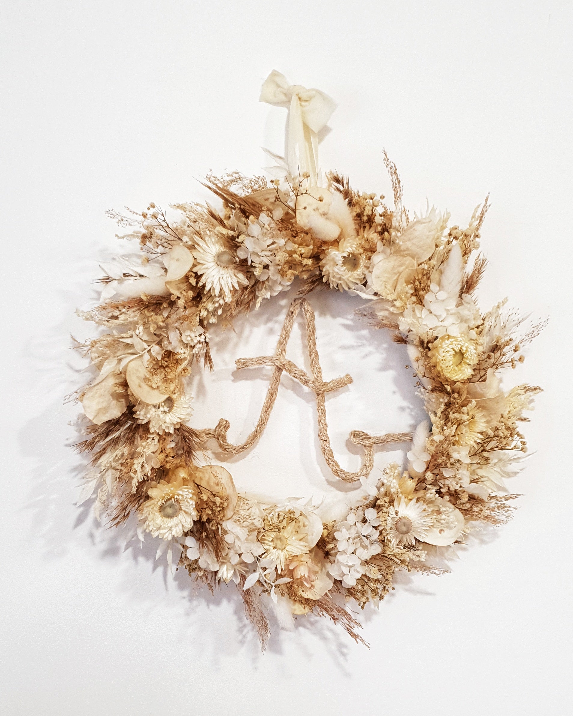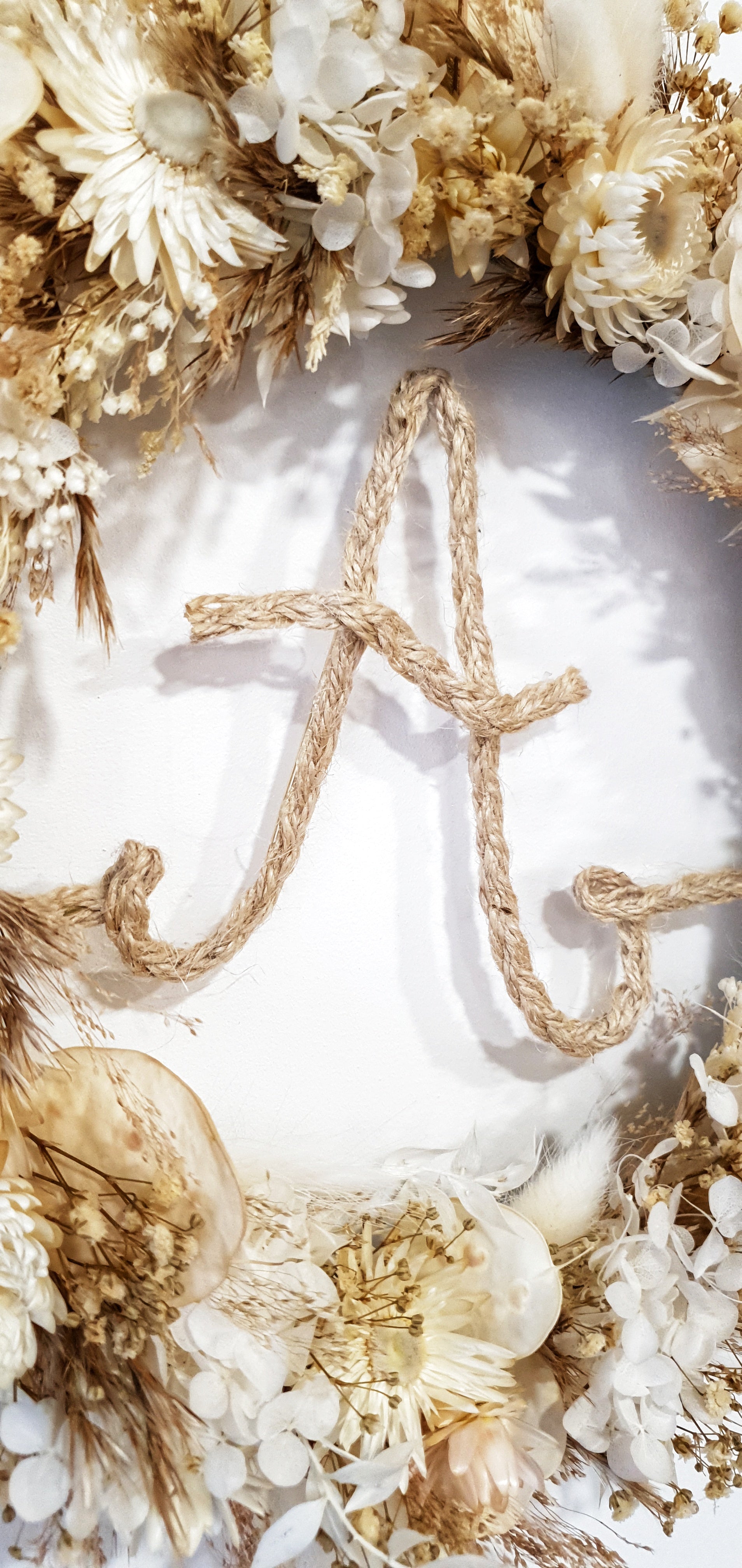 Courone de fleurs séchées et stabilisées avec initiale en corde tressé