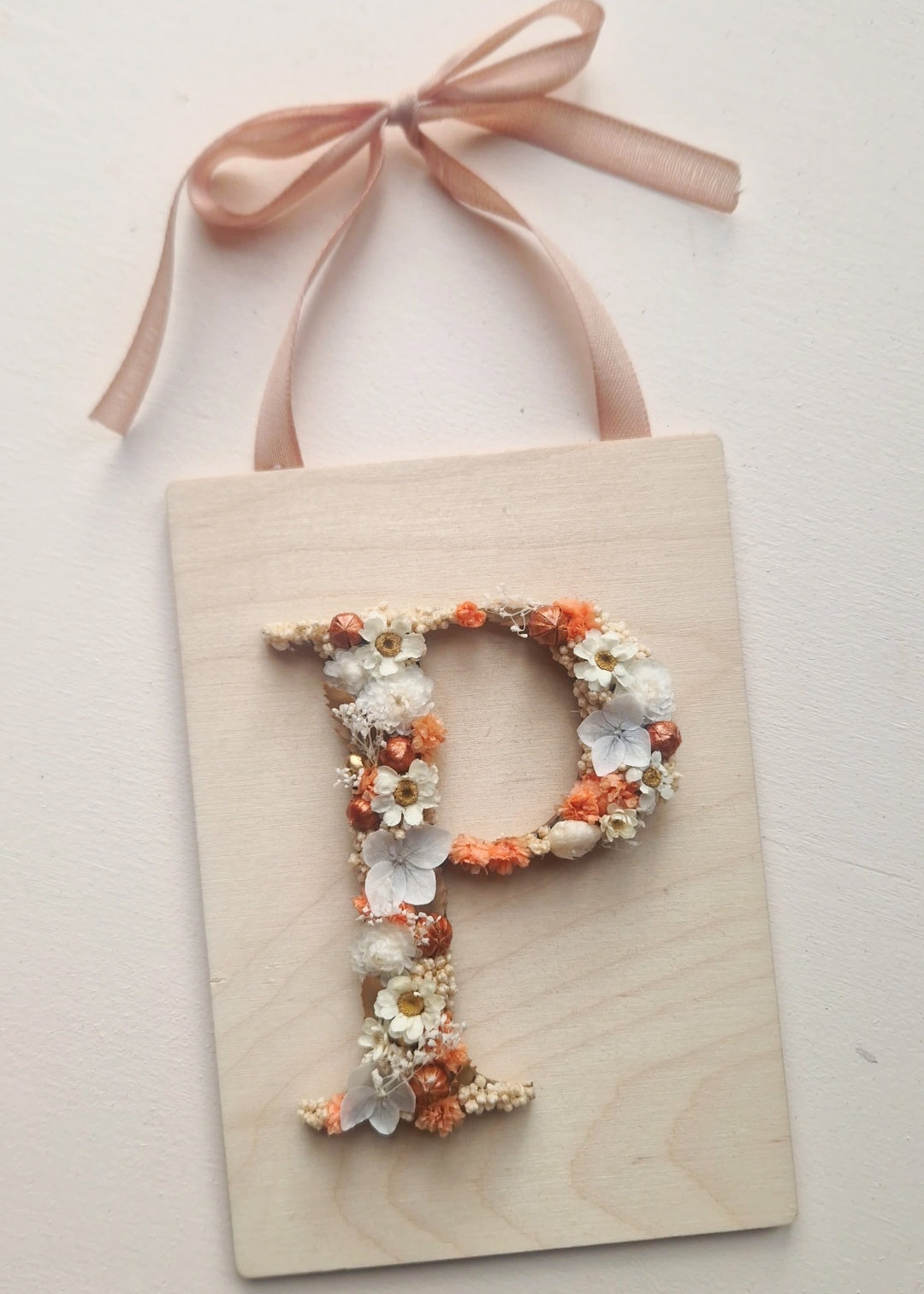 Lettre fleurie en decoration murale . L'initiale de votre choix mise à l’honneur par les fleurs et l’authenticité et la chaleur du bois.