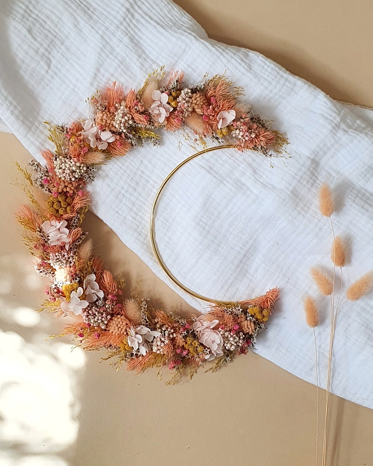 Lune en metal doré agrémentée fleurs séchées et stabilisées
