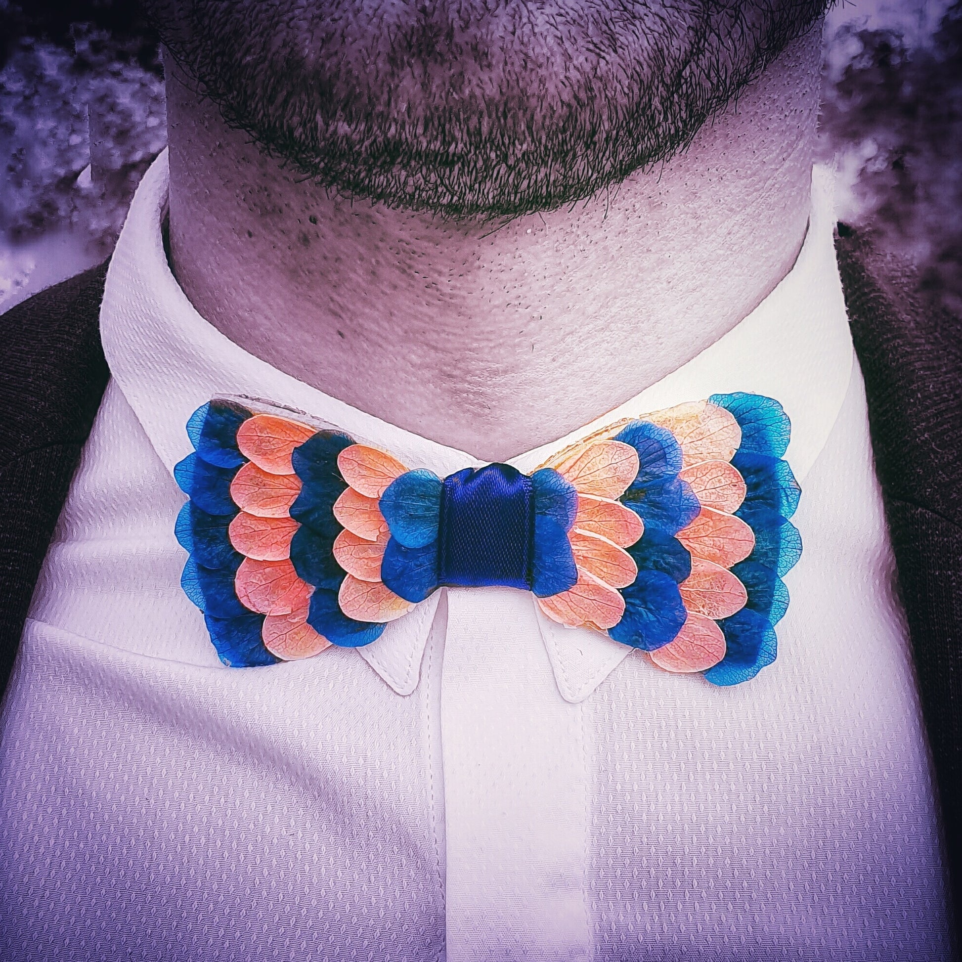 Nœud papillon réaliser avec des pétales de fleurs stabilisées, dans les tons de rose et bleu