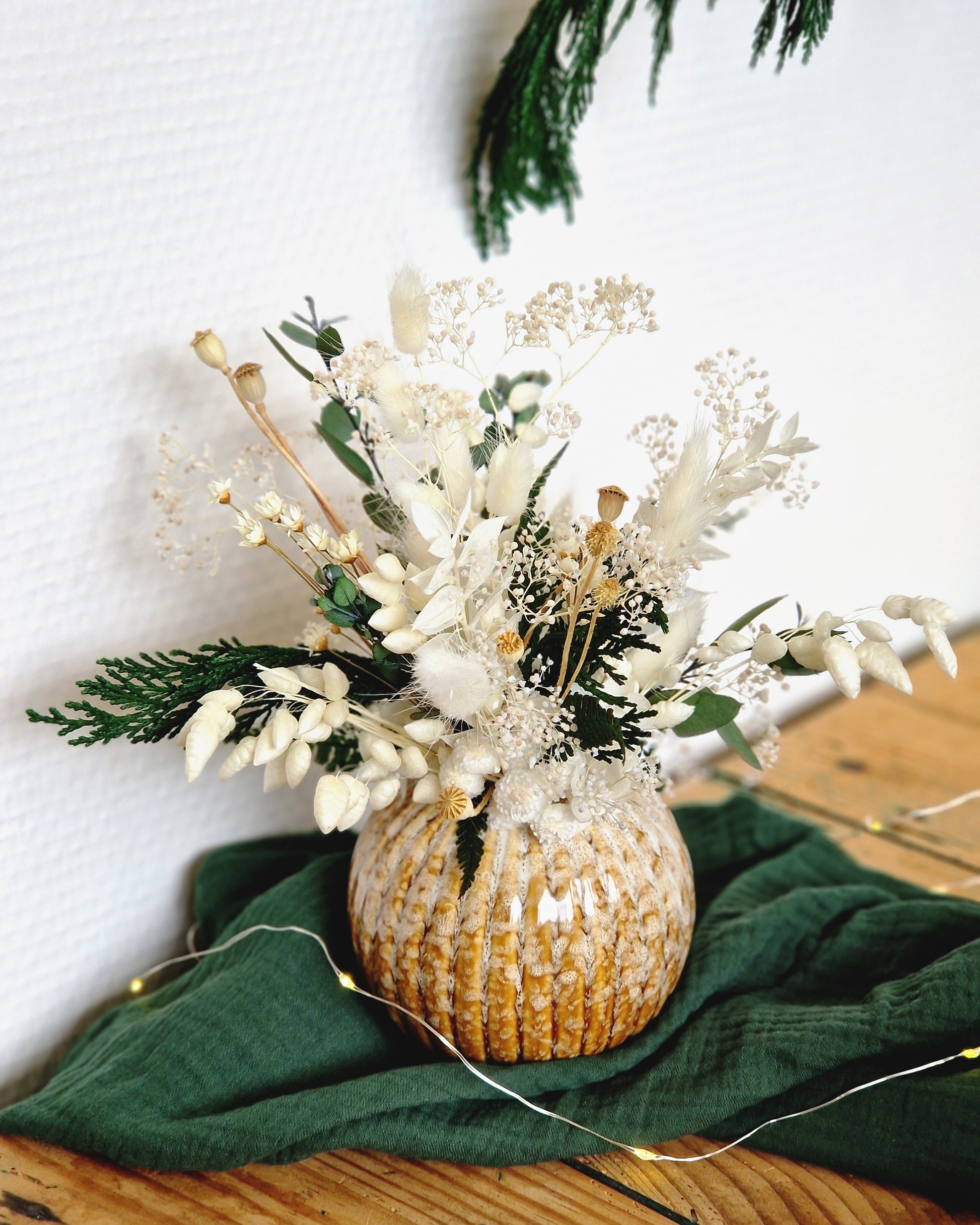 Les fleurs qui compose ce bouquet sont en fleurs séchées et stabilisé dans les tons blanc et vert